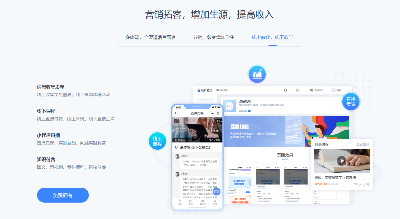 优势:凡科教育是集招生获客、教学管理、家校服务于一体的教育管理系统,配备学费缴报、成绩查询、信息收集等实用工具。还提供课程发布、学员管理、数据统计等服务,实现教学与管理全流程线上闭环服务,帮助教培机构提升管理效率。
