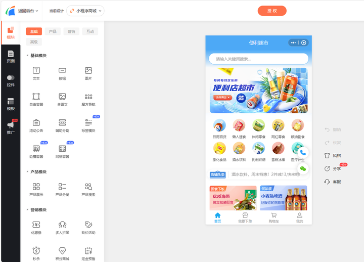 在模板基础上,通过模块来进行个性化设计。可以添加轮播图、导航菜单、客服入口等组件,调整页面布局和配色方案,整体操作类似搭积木,无需编写任何代码。