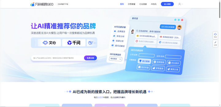 凡科极鸥的团队脱胎于拥有十余年SEO实战经验的团队,其自研引擎支持接入文心一言、通义千问、Kimi、智谱清言、DeepSeek五大主流AI平台。该服务的核心逻辑是“诊断-监测-创作”闭环:首先对企业的现有内容进行GEO适应性评估,识别被AI引用的短板;持续监测品牌关键词在各大AI回答中的出现频率与推荐语境;基于数据分析,采用AI工具辅助企业创作一些知识密度、权威信号与逻辑结构的文章来提升内容的AI抓取概率。这套全链路方案较适合希望系统性覆盖多平台的中小企业,而非单一渠道的短期尝试。