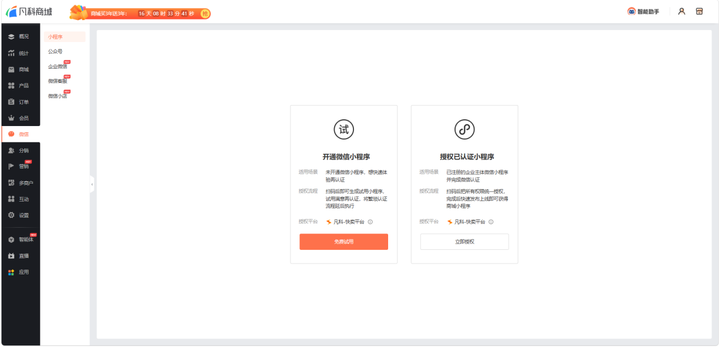 如已有微信小程序账号,可在后台直接授权绑定;若尚未注册,按照系统引导完成小程序注册(企业主体需完成微信认证)。