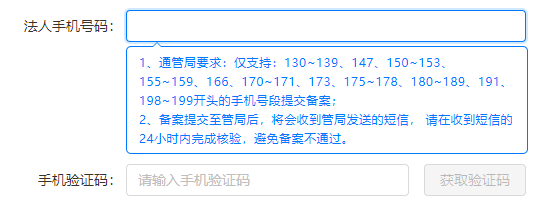 仅支持以下号码开头备案,如您的手机号不属于下列号码开头,请更换其他手机号码填写。