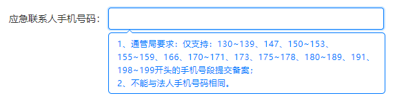 目前备案所需填写的法人及应急联系人手机号码字段开头是有要求的。