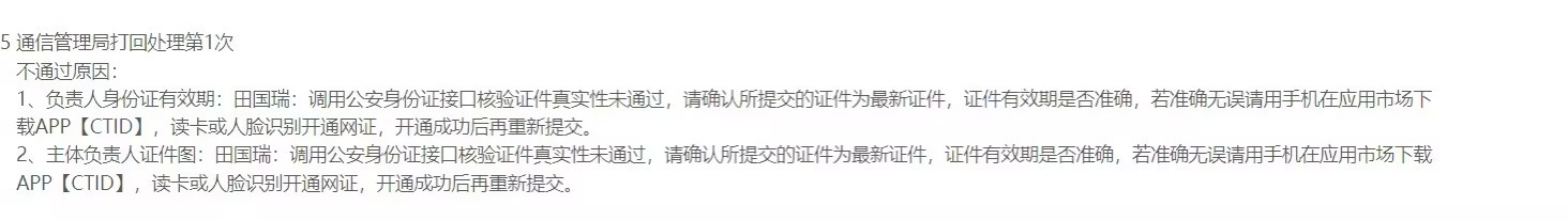 备案打回原因:下载APP【CTID】,读卡或人脸识别开通网证。2025-12-22 11:39:01打回原因:提示下载APP【CTID】,读卡或人脸识别开通网证 。解决方案:如果确认当前是最新证件,请使用手机在应用市场下载APP【CTID】,用读卡的方式开通网证,开通成功后再重新提交备案。(注意:下载了这个APP后可看到里面的操作指引,根据指引操作即可)