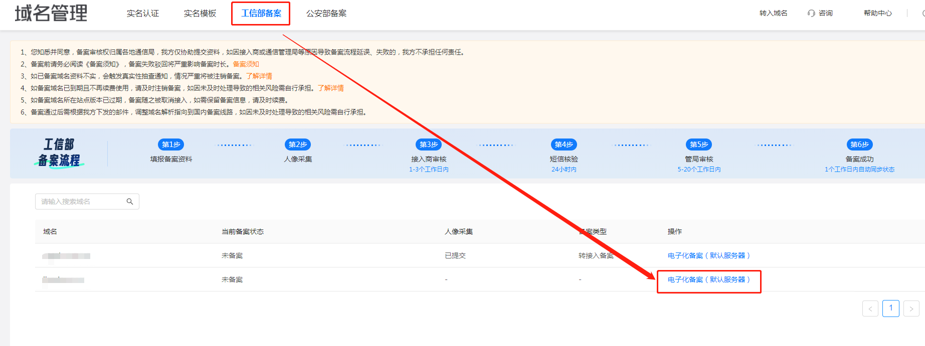 在域名管理---工信部备案,点击右侧按钮【电子化备案】,提交备案资料,等待管局审核。具体备案资料提交教程请参考:转接入备案教程