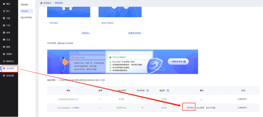 处理方案:在后台取消域名绑定(参考下图),在域名管理平台删除域名解析(具体操作需联系域名供应商)。