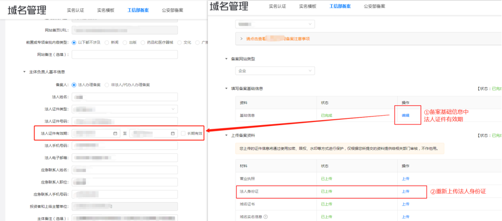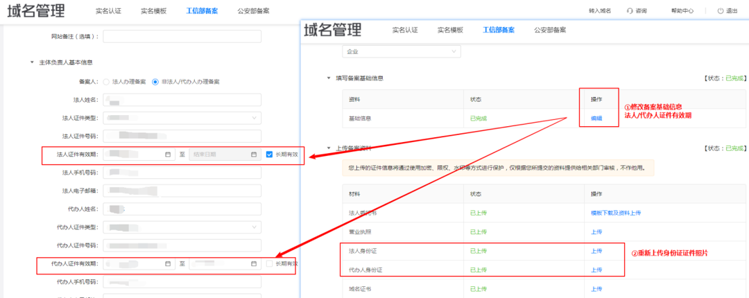在域名管理---工信部备案中点击【备案变更】按钮,即可对负责人证件资料进行修改。
